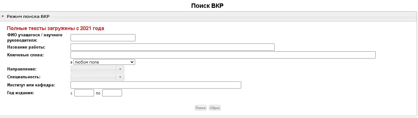 - Удобный поиск: Используйте расширенные возможности поиска по ключевым словам, авторам, научным руководителям, направлениям и другим параметрам.